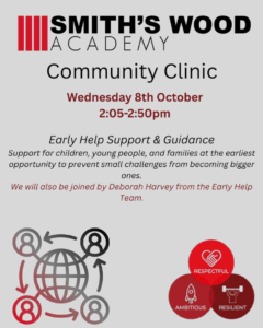 Come along to our next Community Clinic on Wednesday 8th October. An informative session on Early Help support & Guidance.